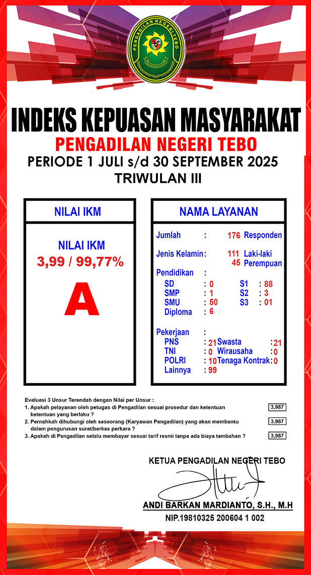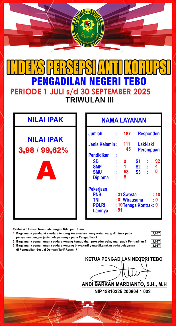 Ketua Pengadilan Negeri Tebo telah menetapkan Surat Keputusan meliputi daftar panjar biaya perkara, biaya radius untuk pemanggilan / pemberitahuan serta biaya proses dalam penyelesaian perkara perdata di Pengadilan Negeri